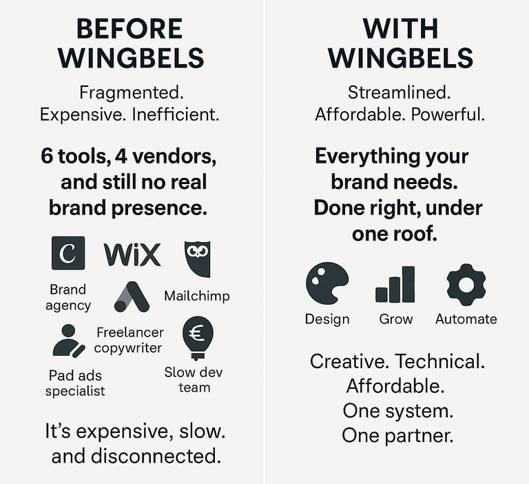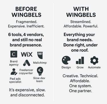 Brands today lose an average of 34% more budget due to tool fragmentation, and spend 46% more time coordinating between teams than creating real value. Between overpriced design agencies, disconnected marketing freelancers, and clunky automation tools, inefficiency is the silent killer of growth. We’re not here to sell you more complexity—we’re here to replace it. Wingbels integrates content, design, customer insights, and automation into a single adaptive engine built around your goals.
